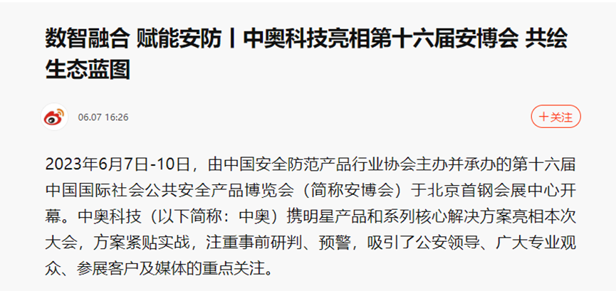 2023年6月7日-10日,為期4天的2023第十六屆(2023)中國國際社會公共安全產品博覽會(以下簡稱安博會)在北京首鋼會展中心圓滿落幕。杭州中奧科技有限公司(簡稱“中奧科技”)“重拳”出擊,以“ 凝聚生態伙伴 共創數智融合生態新格局 ”為主題,盛裝亮相2023安博會,得到了眾多合作伙伴、相關企業的熱情關注,同時受邀央視10科教頻道專題采訪,中國警察網、浙江日報、杭州日報、新浪等多家媒體相繼報道。在此向大家表示誠摯的謝意,感謝一同見證,參與此次展會。