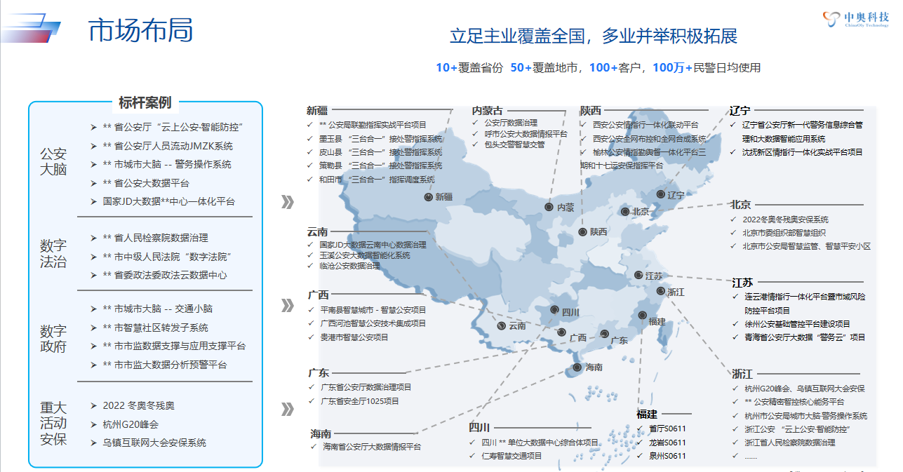 作為國內(nèi)政務、政法數(shù)智領(lǐng)軍企業(yè),中奧科技深耕數(shù)智大腦15年,專注于以產(chǎn)品與方案組合方式服務公安領(lǐng)域 10+ 年,通過業(yè)務+數(shù)據(jù)+智能融合方式引領(lǐng)行業(yè)數(shù)智發(fā)展,構(gòu)建生態(tài)合作體系,堅持自主創(chuàng)新,擁有 30 +軟件發(fā)明專利、110 +軟著、 創(chuàng)建10 +產(chǎn)學研聯(lián)合實驗室,沉淀 100 +算法模型及AI應用,為杭州G20峰會、烏鎮(zhèn)互聯(lián)網(wǎng)大會、2022北京冬奧會等活動提供核心數(shù)智技術(shù)安保服務。